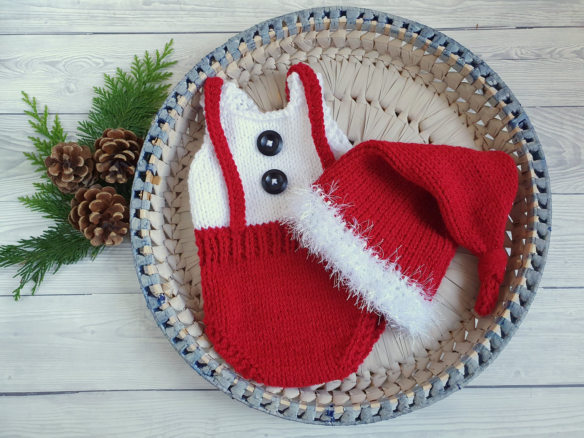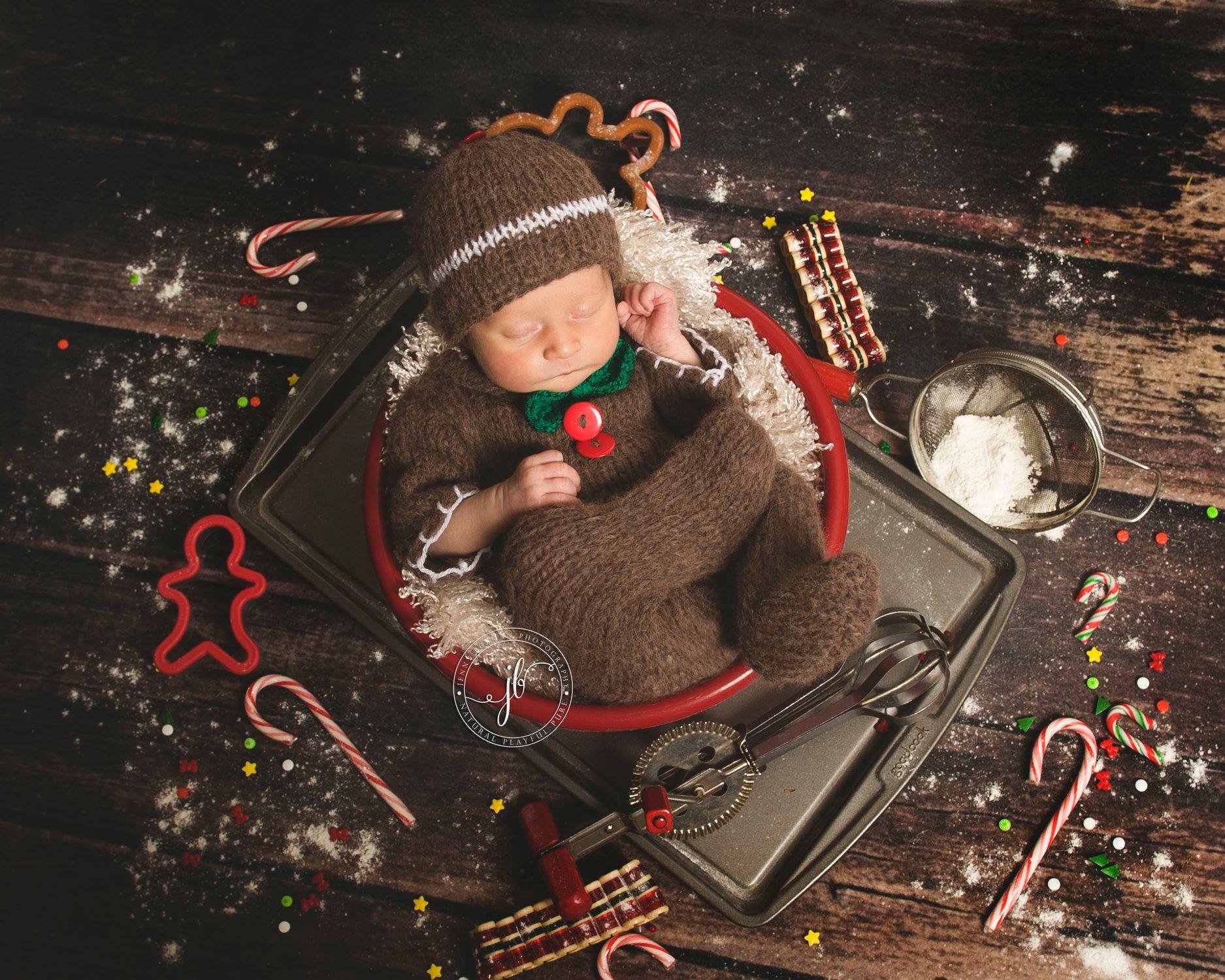 My absolute favourite is this little gingerbread man. Your baby will be warm and snug in the footed outfit for his photoshoot. The romper has a crochet collar, with a green bow tie, 'icing' detail on the sleeves and the beanie, with little red buttons on the chest.