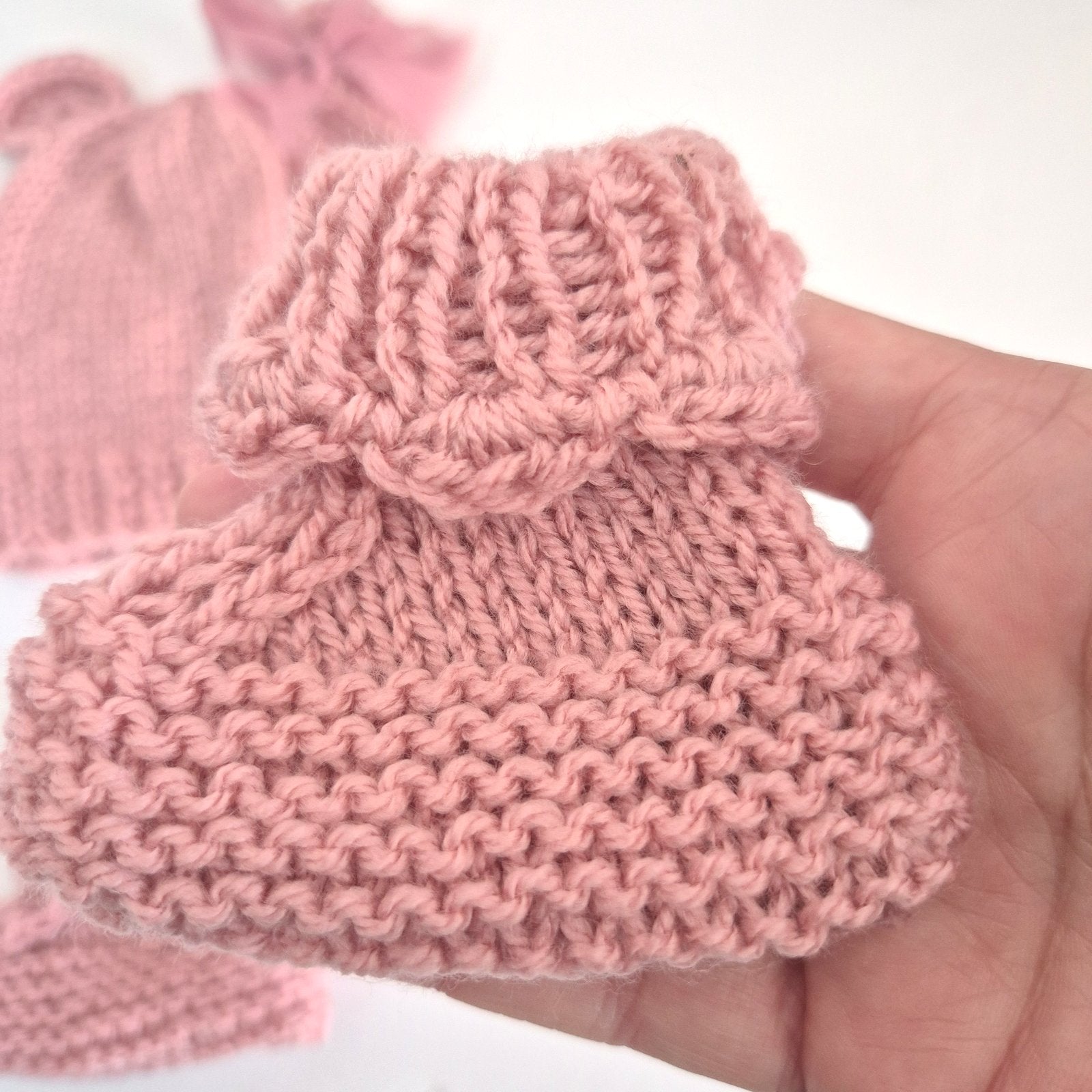 Handknit baby hat with matching booties for a baby girl. This one fits a baby from 0-3 months old. It is knit in soft acrylic yarn, with a pink chiffon bow. The booties have a wide cuff, to stop them coming off wiggly little feet too easily. Very soft and cosy- just what you need for baby cuddles!