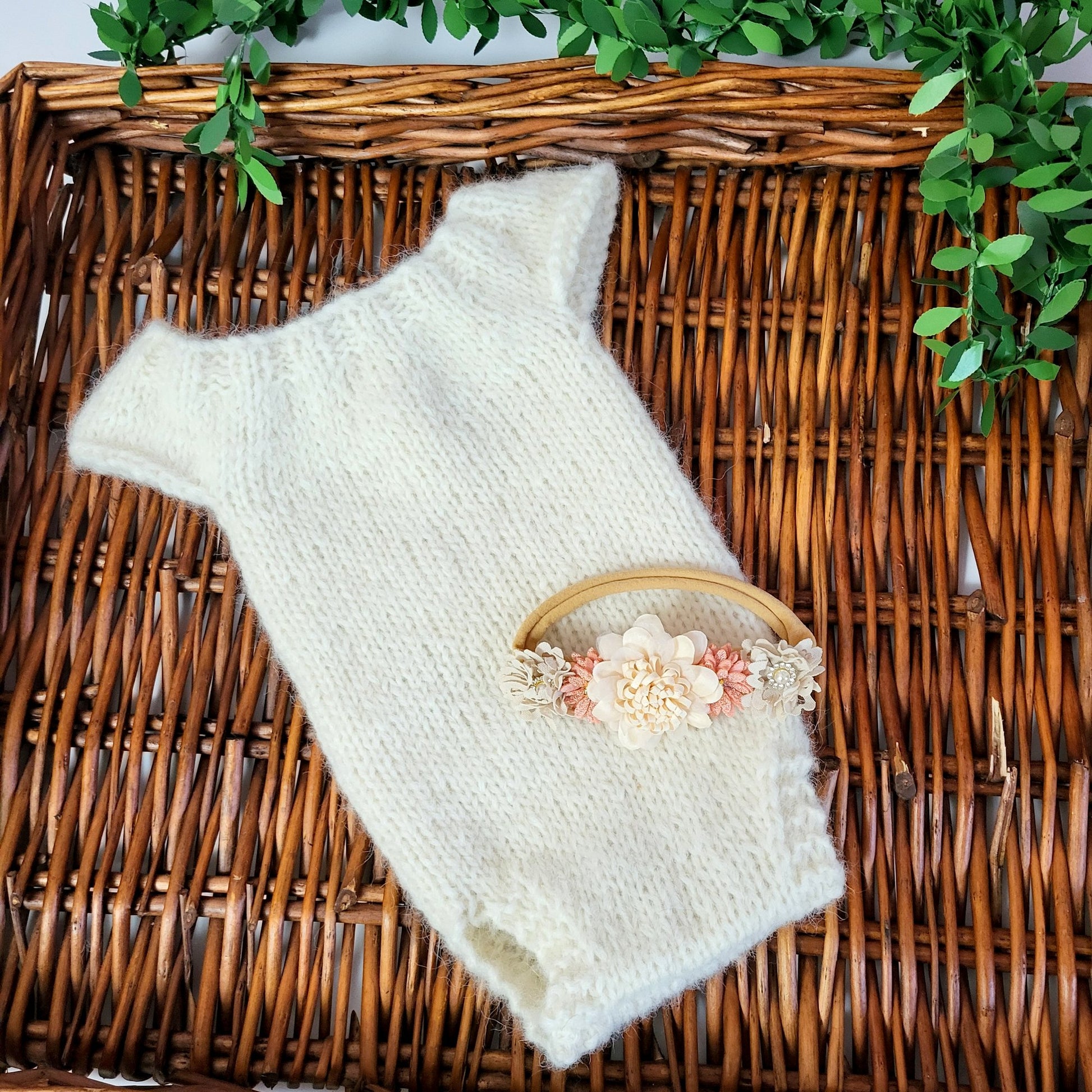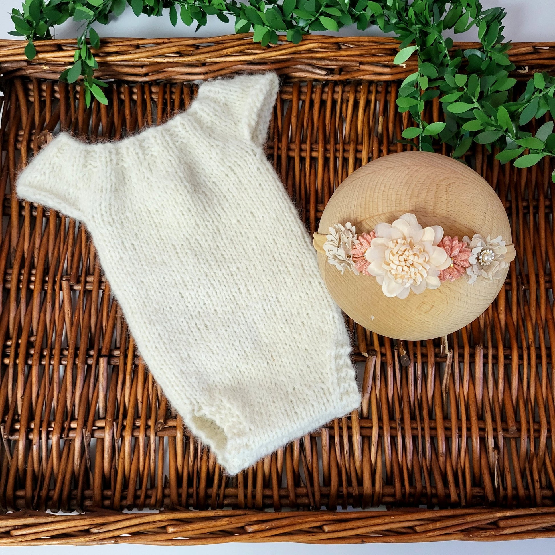 Cream knitted alpaca Newborn Romper + FREE headband (Ready to Send)