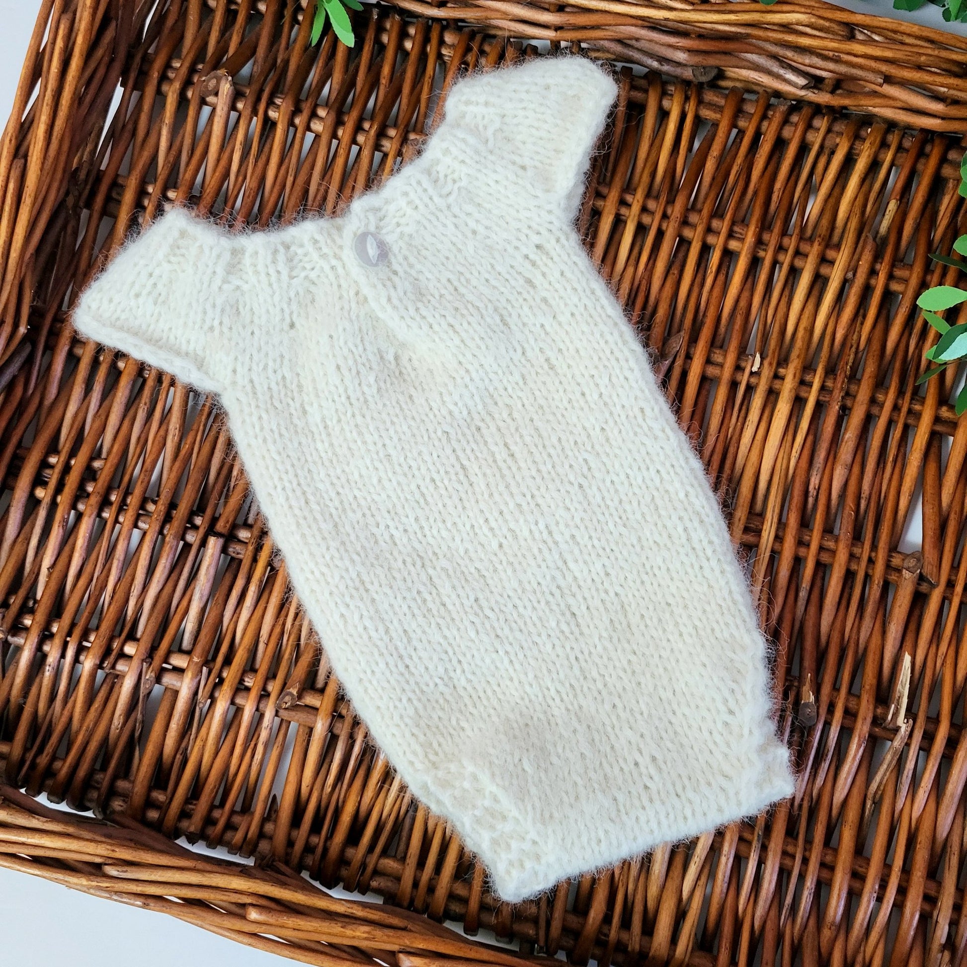 Handknit little bodysuit is soft and stretchy, and will fit a baby of approx 0-1 month old.