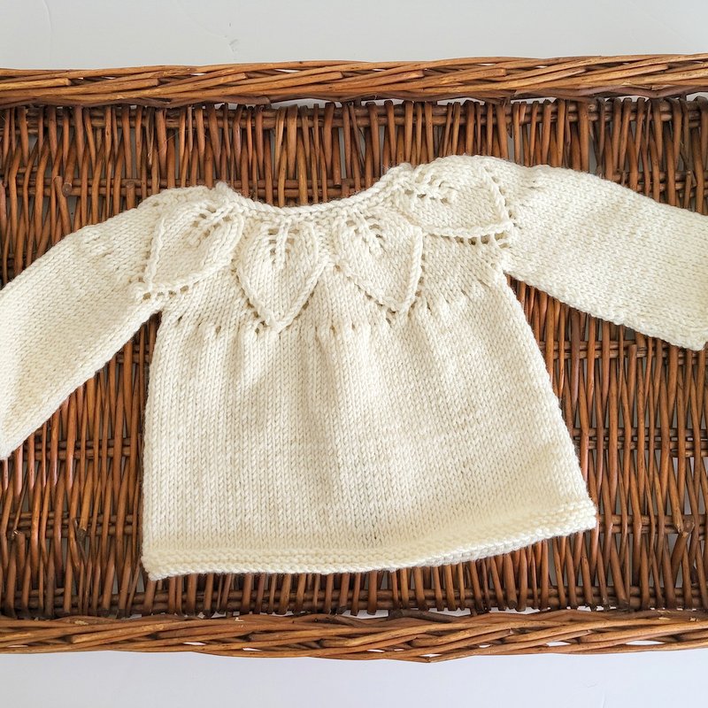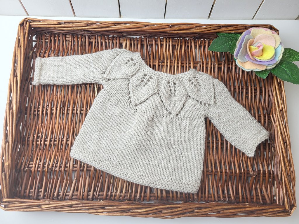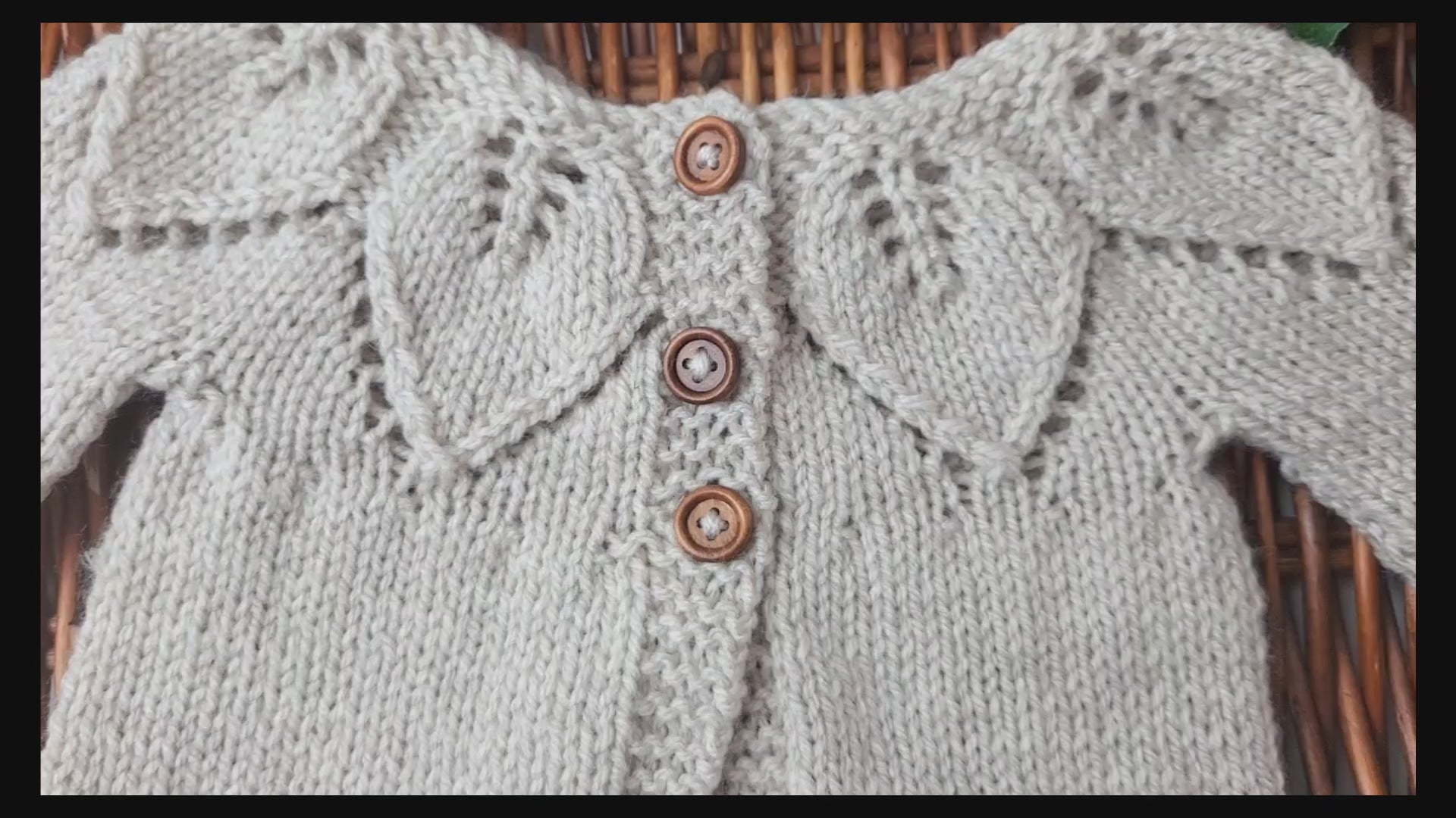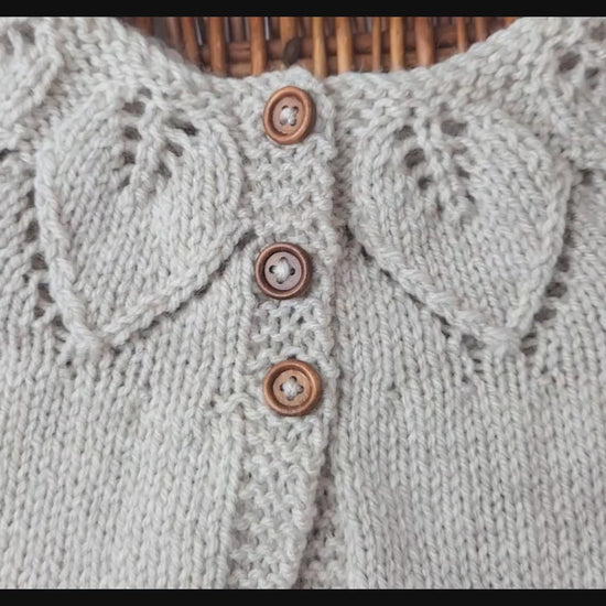 A gorgeous hand knit baby cardigan with a leaf pattern around the neckline. A simple, classic style that is suitable for baby boys or girls.