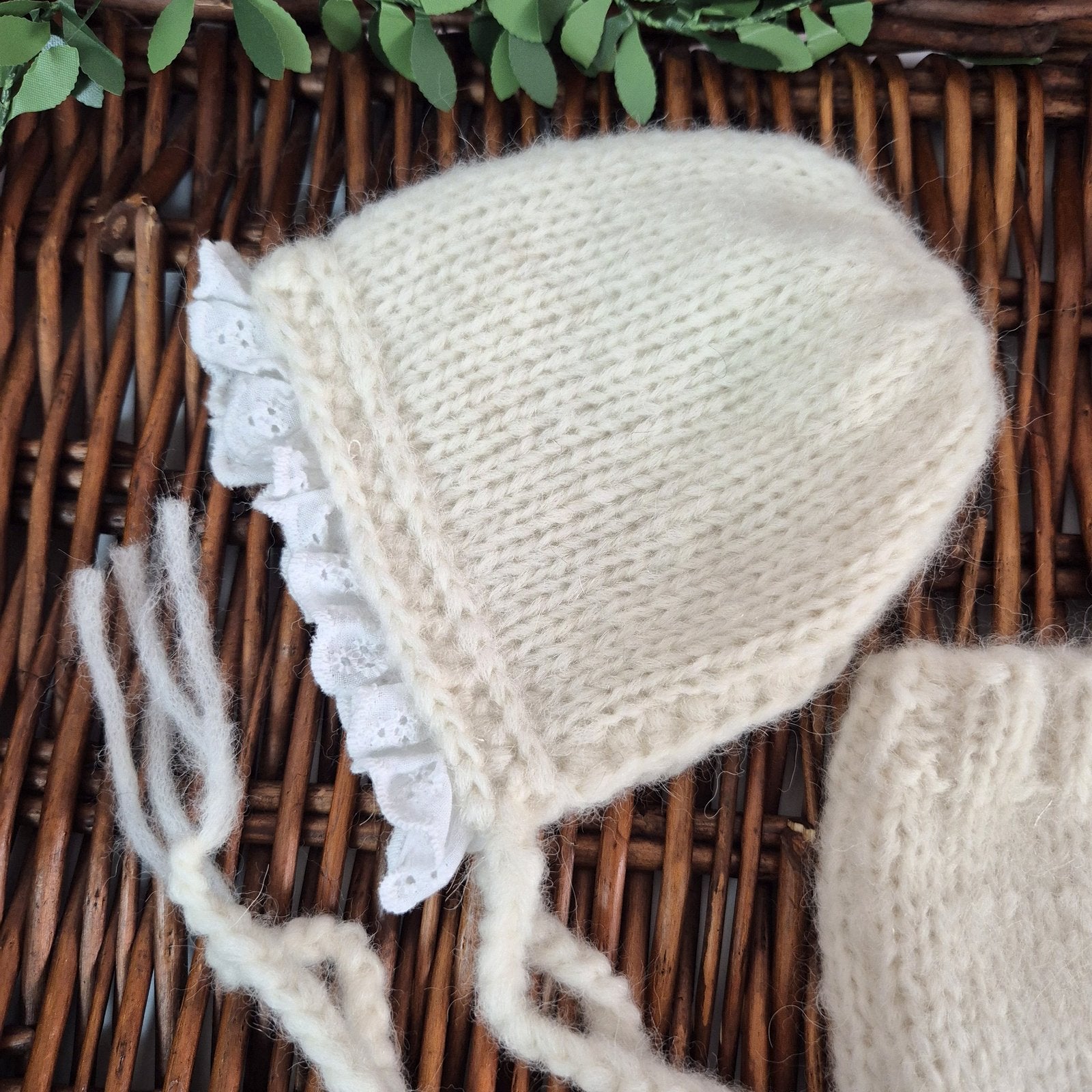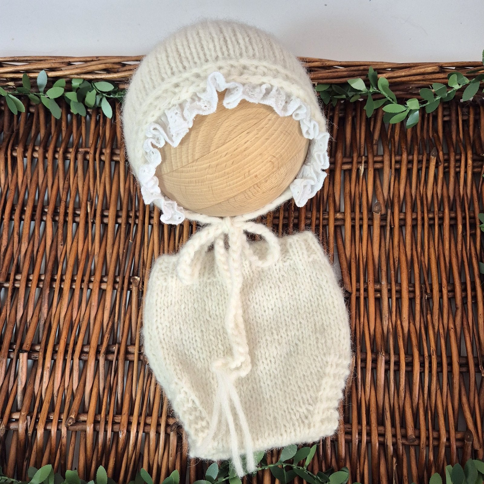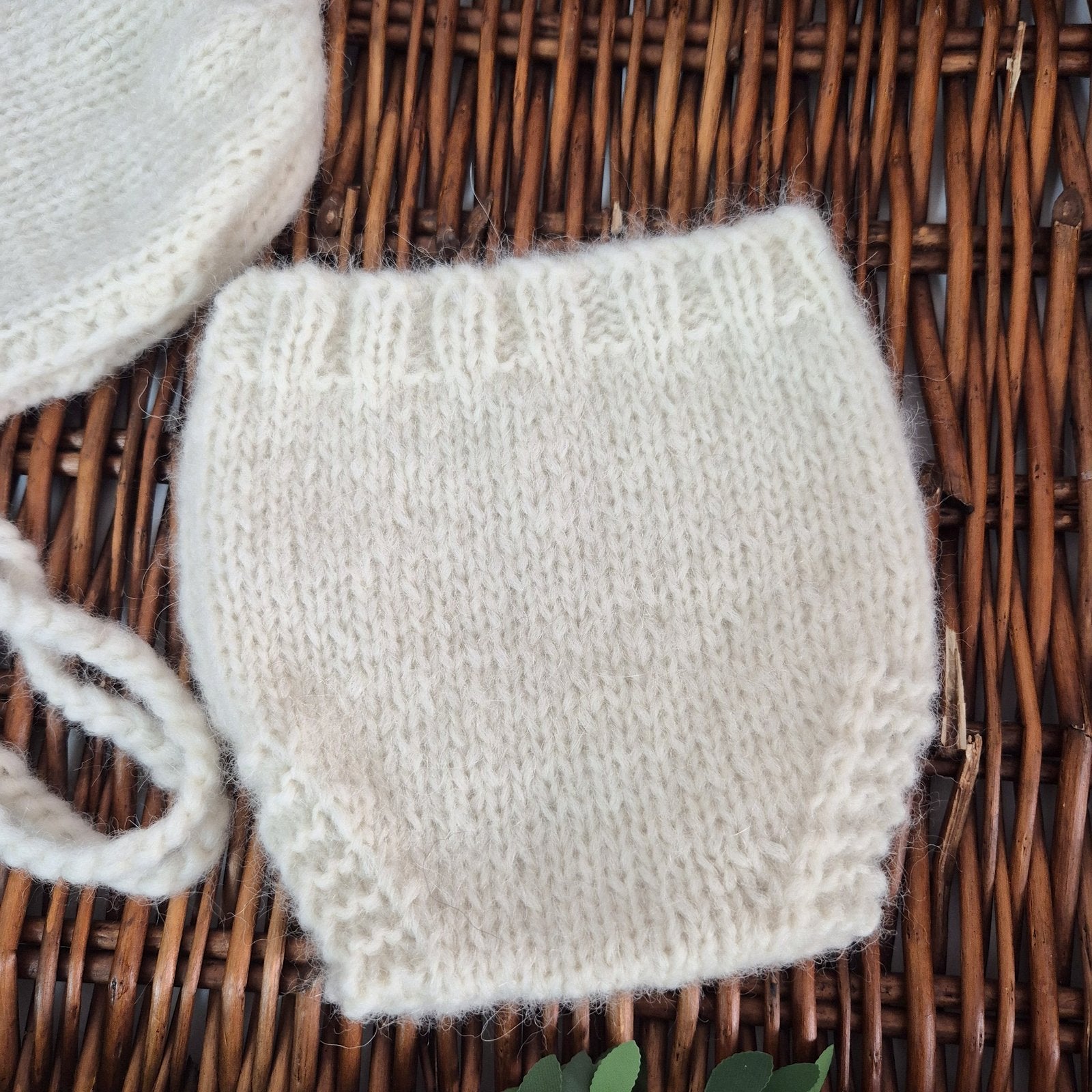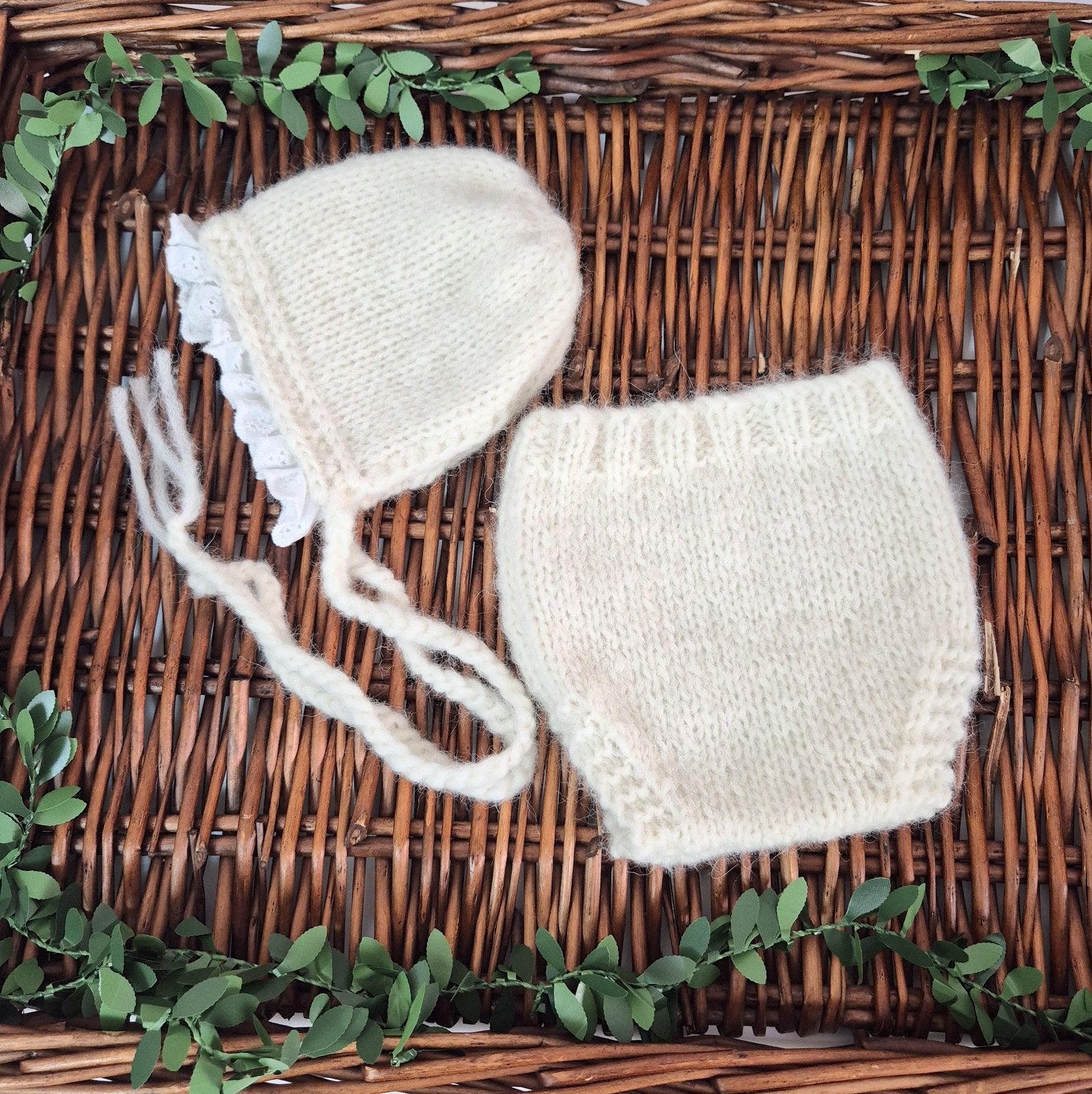 The bonnet has a sweet broderie anglaise frill around the face, with crochet neck ties. The little pants are just right for covering diapers, so that you don't need to use a wrap/ blanket.