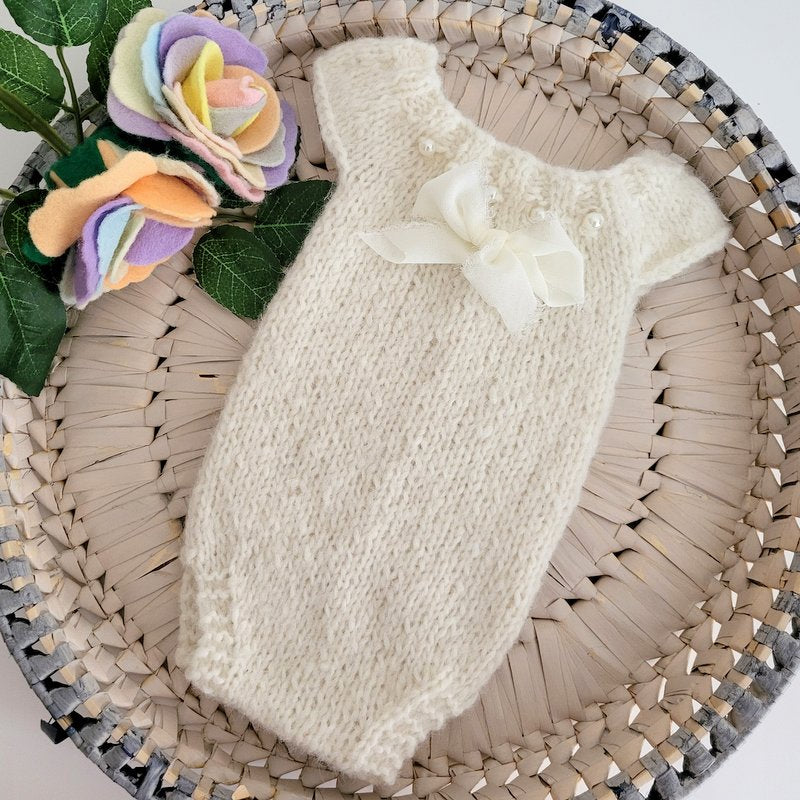 Handmade knitted baby girl sleeveless romper with pearls and a chiffon bow. For use as a newborn photography prop. Knit in super soft alpaca yarn, that is gentle on newborn skin. Made to order in a few days.